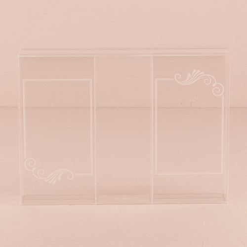 This unique photo and sand ceremony shadow box features not only a separate compartment for the bride and groom to fill with sand, but also two compartments designed to hold standard 4” X 6” ~ 10.2 cm X 15.2 cm photos. Simply place the photos between the two layers of acrylic provided and slide into position. Stylish etching will provide beautiful framing to complete the look. Following the wedding, this will make the perfect keepsake that can be displayed in your home and enjoyed for years to come. Compartment holds 2 bags of sand and the top has a piece that slides in and out to keep sand secure. Colored sand and pouring vases sold separately. Materials: Acrylic. Engraving of monogram included in price.