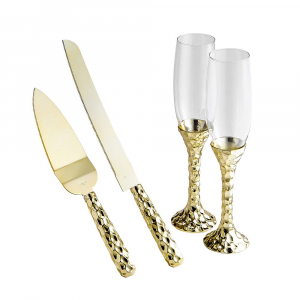 The cake server and cake knife have Stainless Steel blades with serrated edges. They feature matching poly resin handles with a hammered shiny gold plated finish.