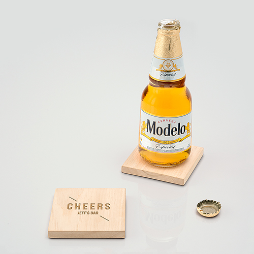 - Natural Wood Coaster With Built-in Bottle Opener - Cheers Etching