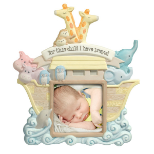 This frame is a perfect gift for a baby shower. The frame features a Noah's Ark on waves with a dolphin, elephants, giraffes, monkeys, pigs, and owls. The inscription reads For This Child I have Prayed. The frame is made of resin, measures 7.25 tall x 8.125 inches long and comes in gift boxed. A great gift for new parents or baby shower gift.