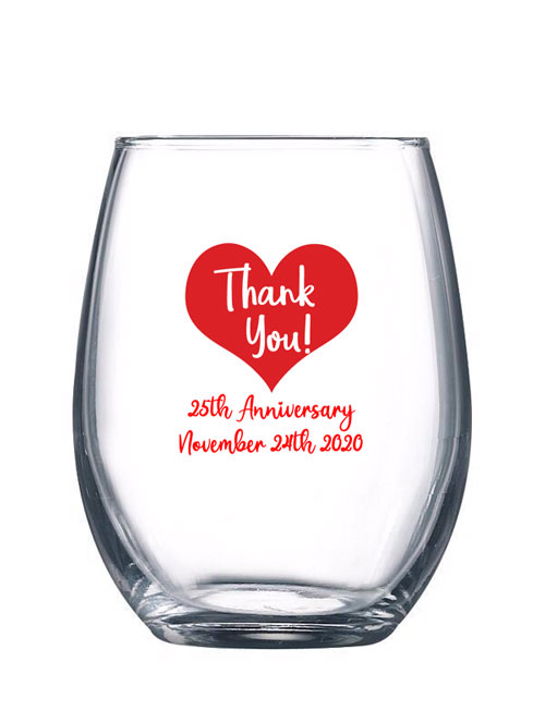 Give each toast a personal touch with these large 12oz stemless wine glasses! The perfect wedding favours, bridal showers anniversaries and your next corporate event. Personalize with your names and the event date for fabulous mementos and tabletop decor. 4.8 inches (H) x 1.75 inches at bottom (W) -2.5 inches at top (W) Add a gift box only $1.00 - Also available in 9oz - 15oz and 17oz