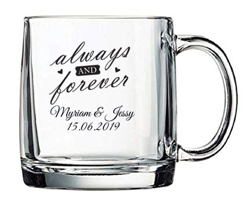 This 13oz glass coffee mug is a fan favorite for any event. The clear glass design measures 3 3/4" x 3 1/4" and is the perfect favour your guests will love.