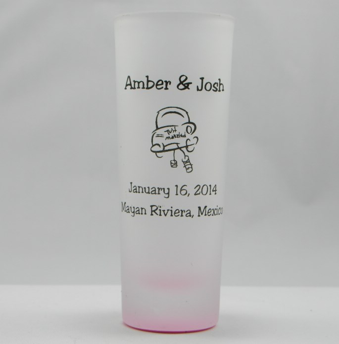 Our frosted 2 oz. Tall Shot/Shooter glass with coloured bottom (also known as a tequila shooter, cordial, or bud glass) will be the life of the party. Holding up to 2 ounces of liquid. This 2oz printed shooter shot glasses makes the perfect customizable glassware product for any occasion. Match the color of your frosted shooter glass to that of your wedding theme and create an effect your guest will be certainly talk about for years. Choose from our clipart and font selection below to customize your message or image, or send your custom design.