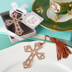 This beautiful rose gold cross book mark makes a stunning religious keepsake for your guests to celebrate your blessed event.