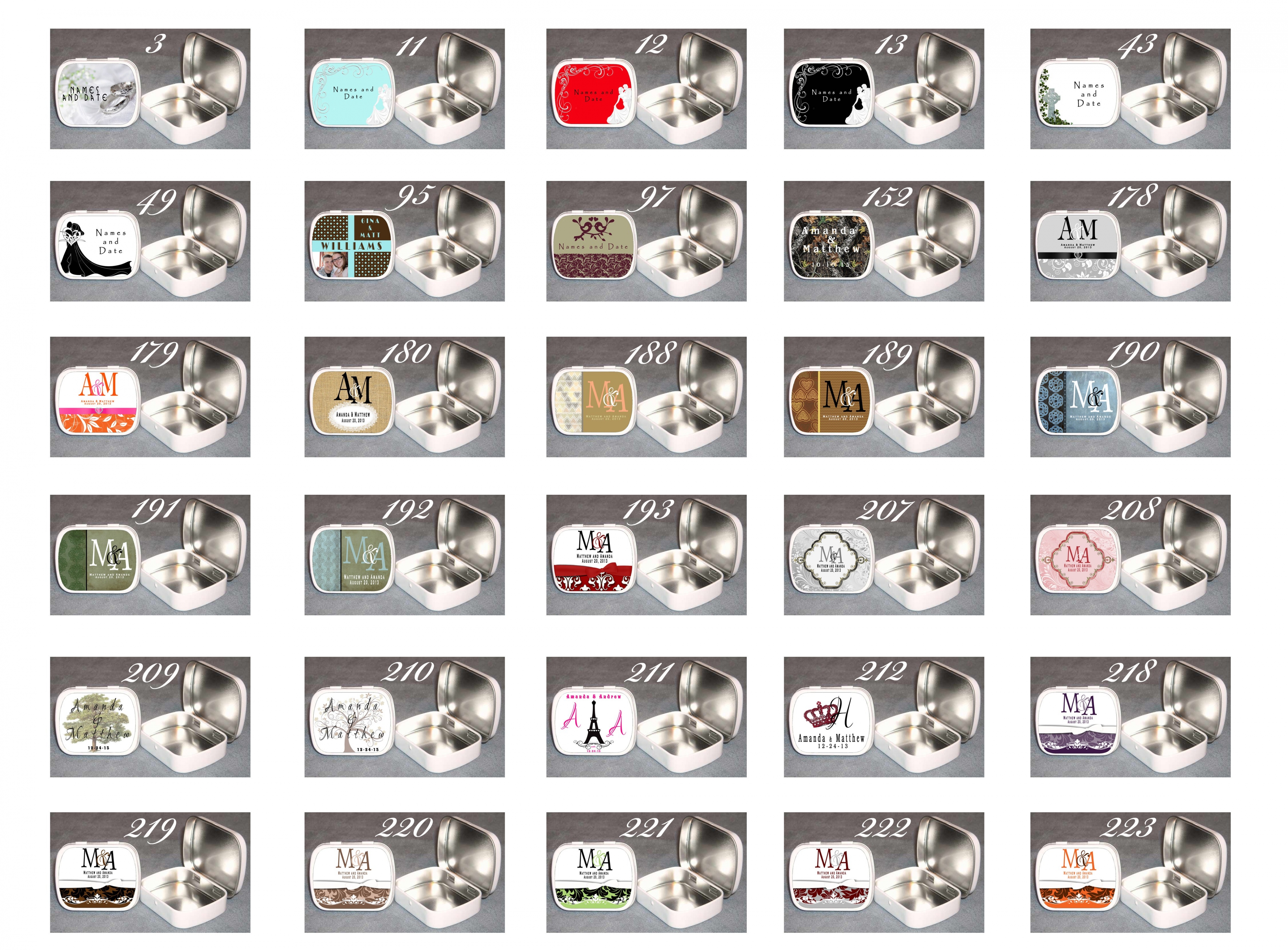 Looking for a fresh choice in one-of-a-kind favors? These wedding themed personalized mint tins are just right, the possibilities are endless for what you can put on the inside. That's because you can fill them with mints, candy, confetti, coins and so much more AND you give it the personal touch by adding a label that you choose from or if you have your own idea I can work with that. Each metal rectangular palm size mint tin measures 2.375" x 1.875", the rectangular altoid mint tin measures 2 5/16" x 3 11/16" and has a sturdily constructed hinged bottom and top - perfectly fit for the application of the personalized label of your choice. Mint tins are available in White, Silver and Black (Black only available in palm). Your design will be printed on a High Quality label and the mint tin favors come bulk packed with self sticking label sheets included for you to easily apply.